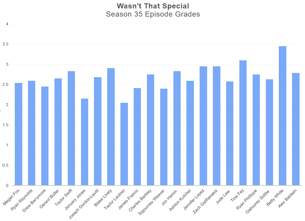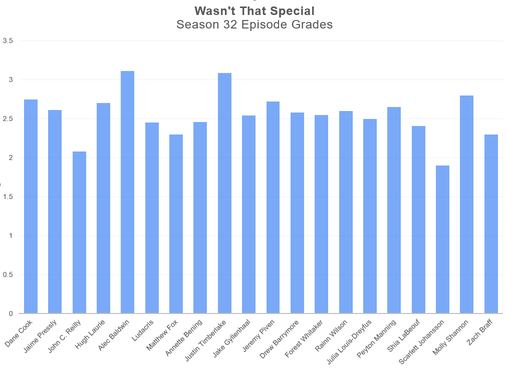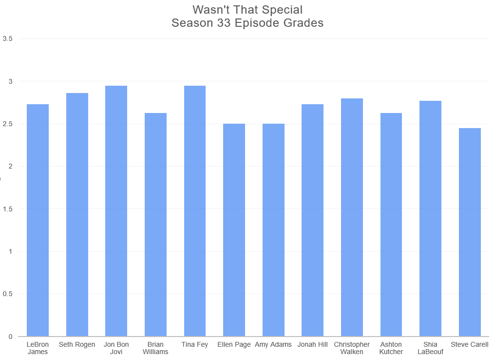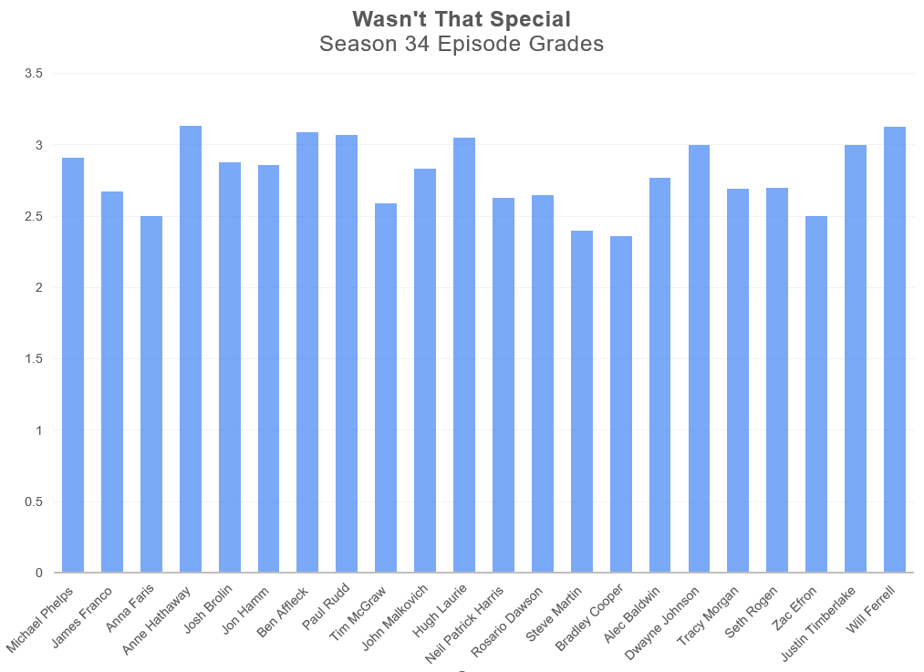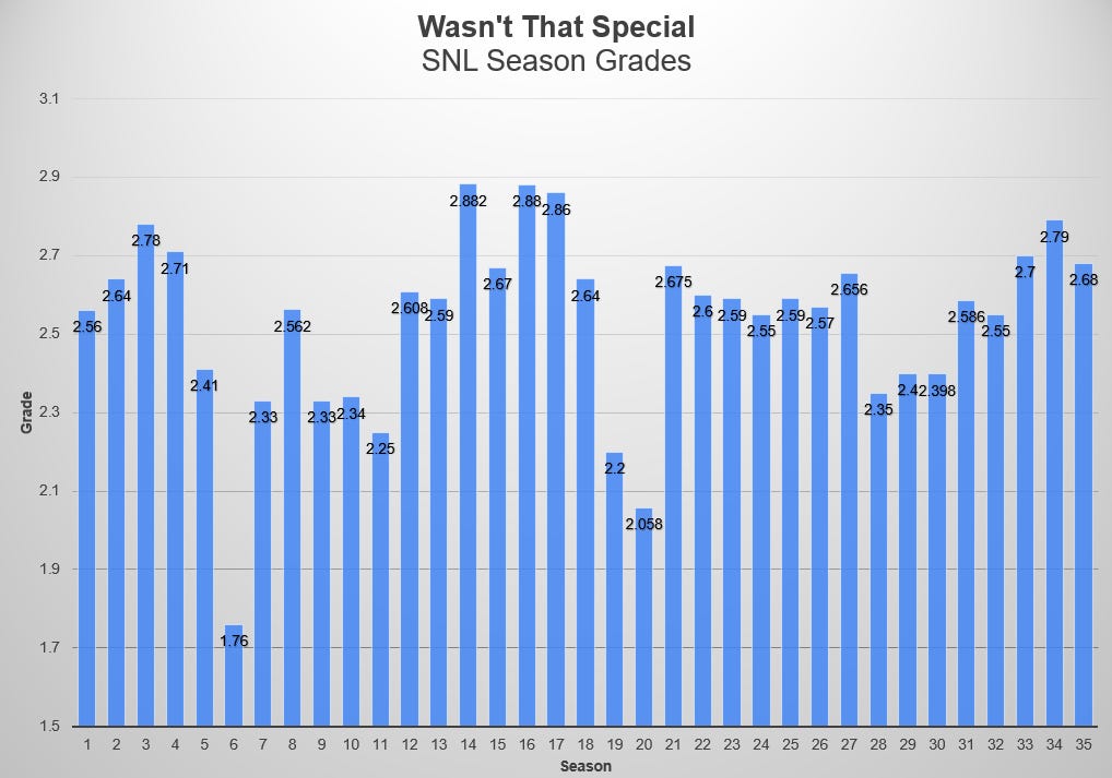 The grading scale is simple: an all-time classic sketch gets a “5,” while only the most appalling sketches get a “1.” A pretty average episode will come in at around a 2.5, while a really good episode will top 3.0.