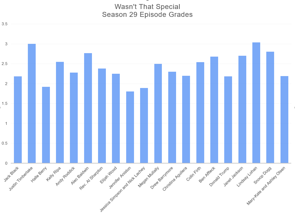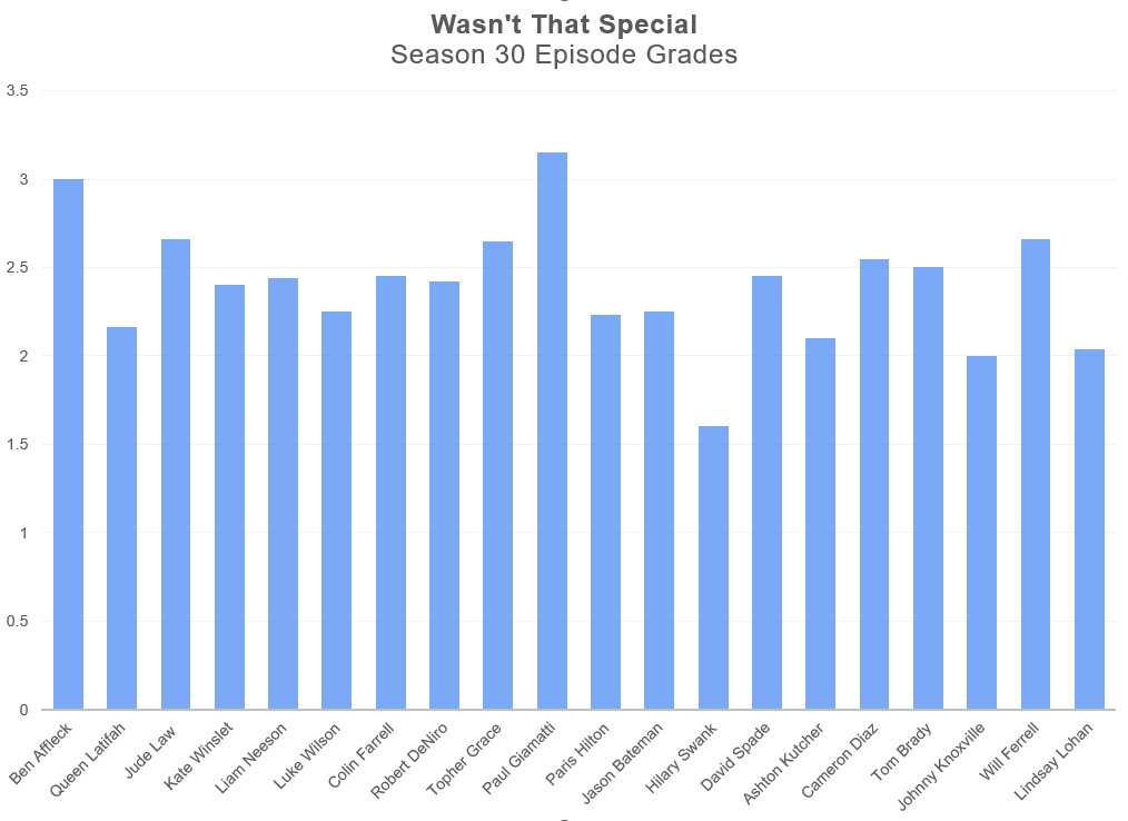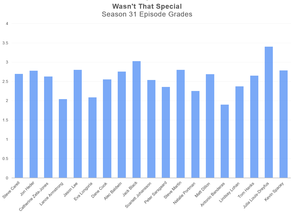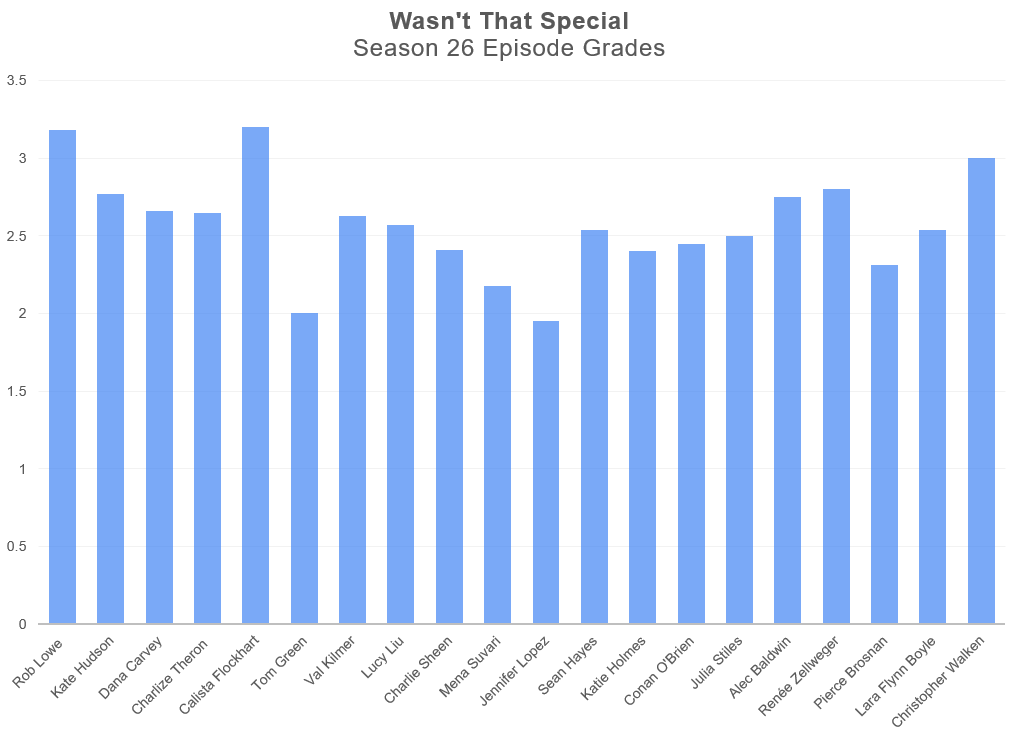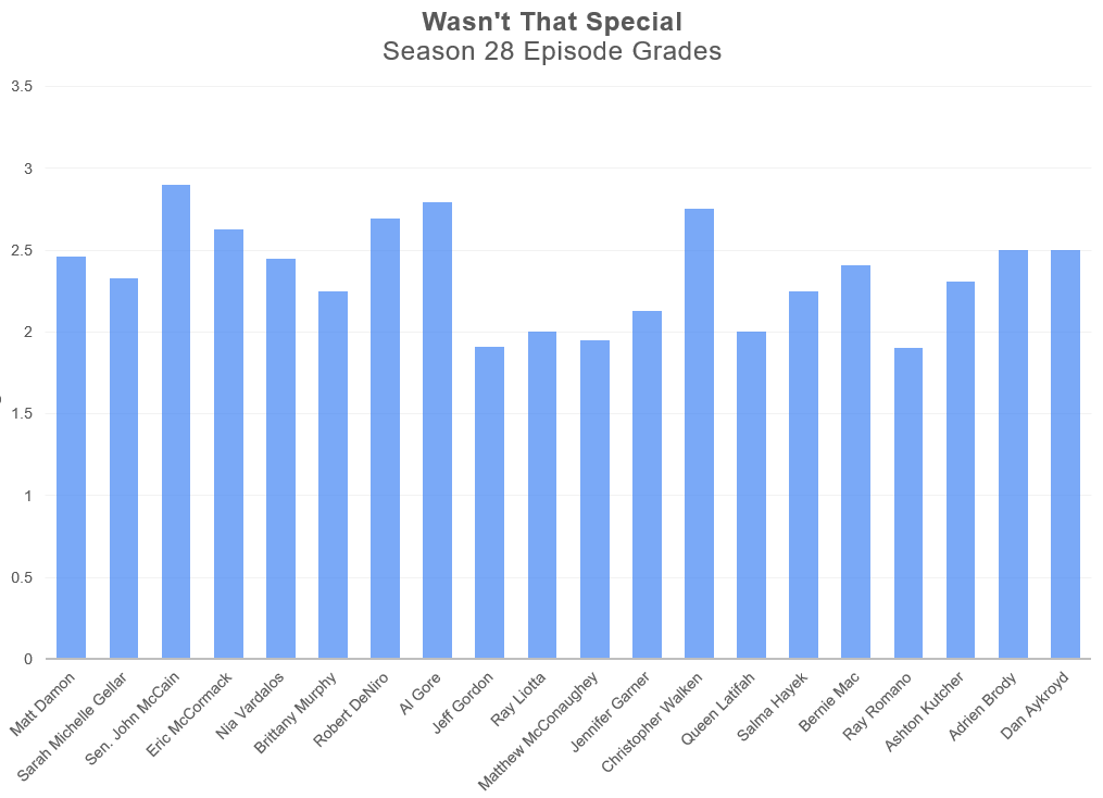 The grading scale is simple: an all-time classic sketch gets a “5,” while only the most appalling sketches get a “1.” A pretty average episode will come in at around a 2.5, while a really good episode will top 3.0.