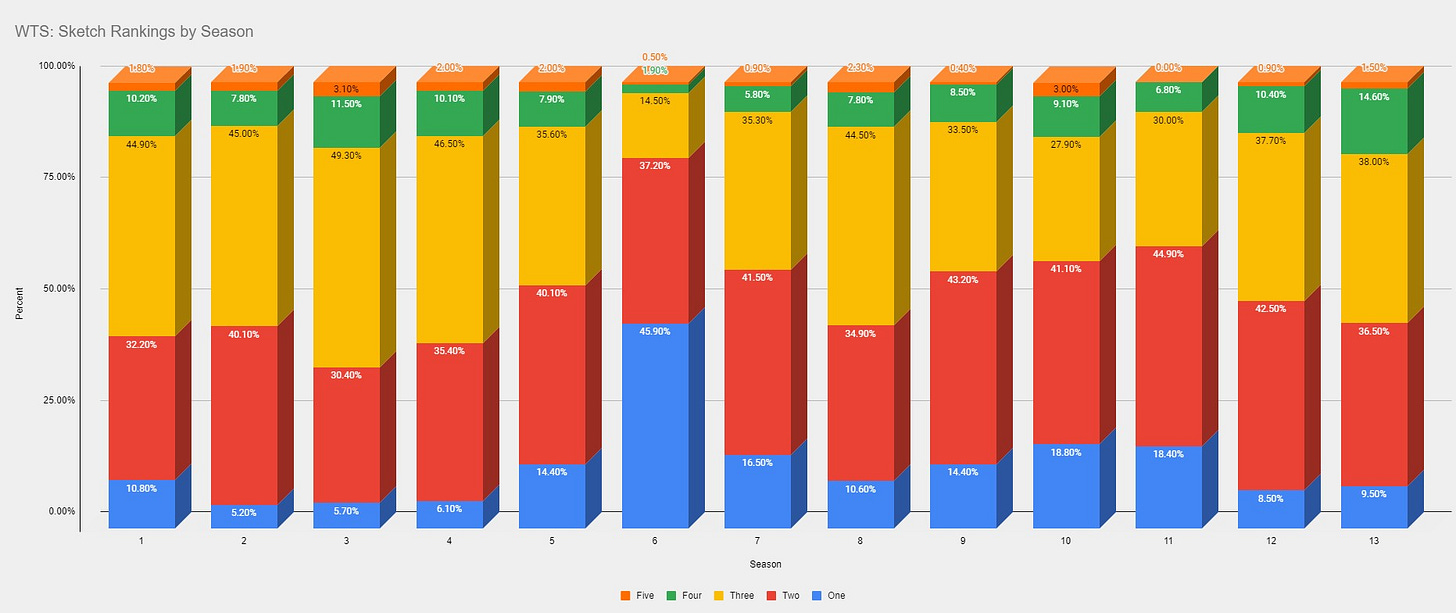 So, take the most extreme example - Season Six - and you notice 83.1% of all sketches were rated either “1” or “2,” making it a truly dreadful season. By contrast, 63.9% of the sketches in Season Three, the best season, warranted a “3,” “4,” or “5.”