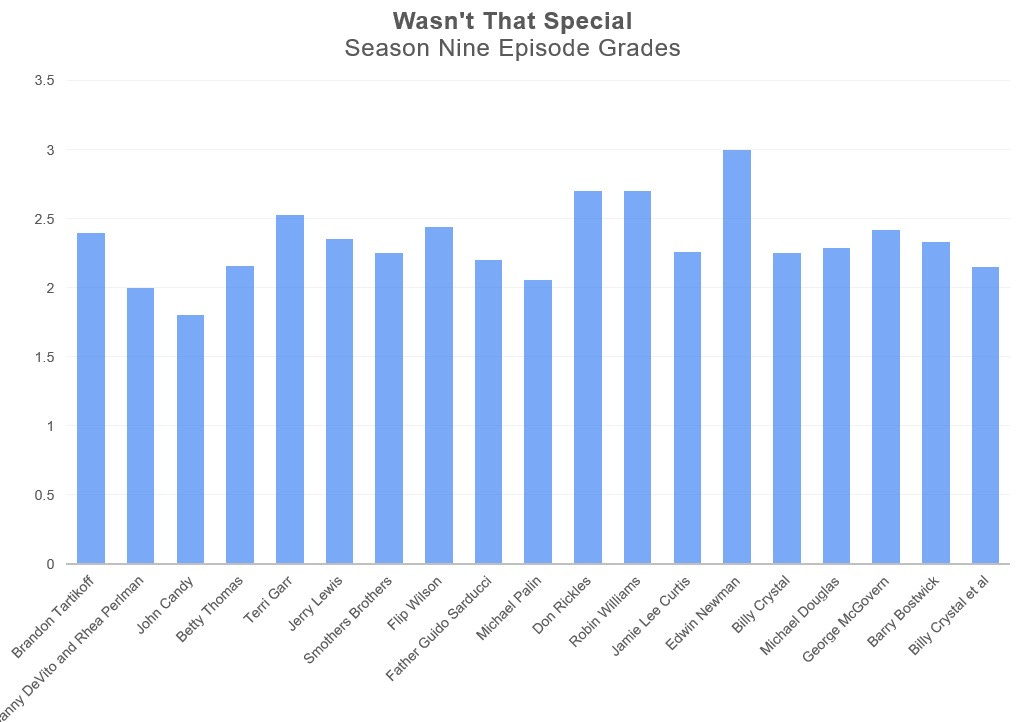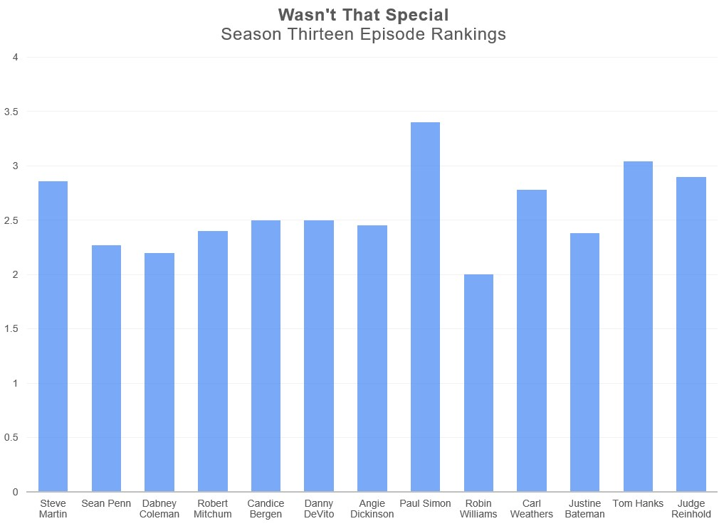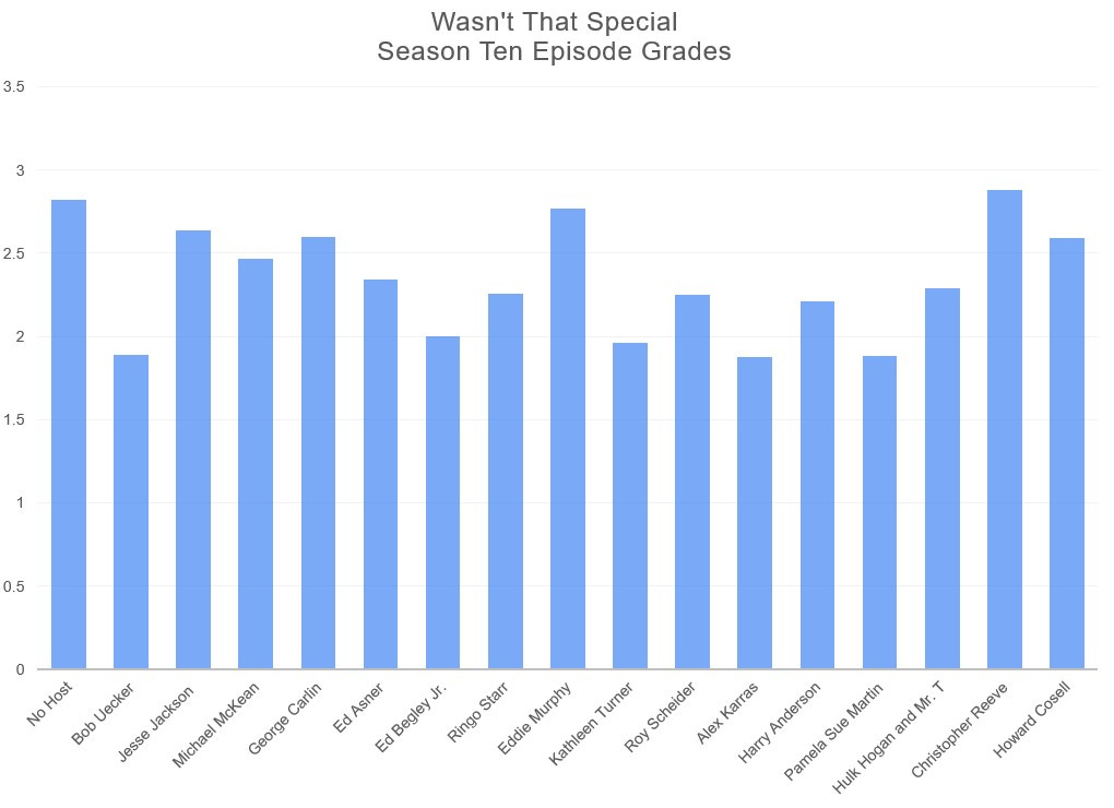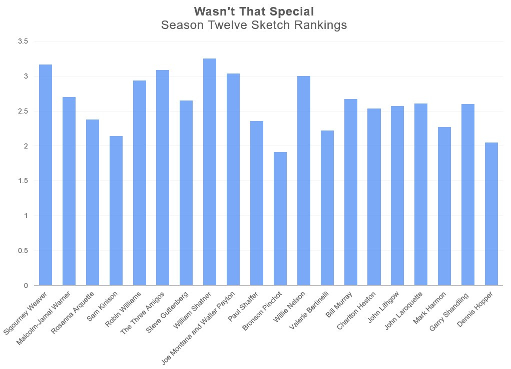 Behind the scenes, we have argued whether one season should be ranked higher than another similarly-graded season if it has better sketches at the top-end. For instance, imagine you had a season with 50 sketches graded at a “5” and 50 graded at a “1.” Then you had another season with 100 “3”-graded sketches. It seems like the season that was half-brilliant, half terrible should get the edge over the season that was thoroughly mediocre the entire way through, right? We should reward the show’s best moments.