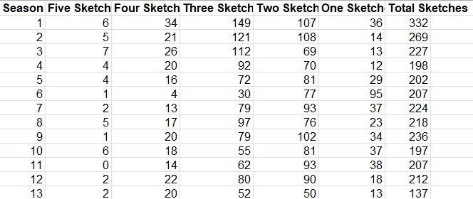 So in order to determine which seasons were most top-and-bottom heavy, we added up all the sketches and their grades, leading to this chart, which gives us an idea of sketch quality distribution: