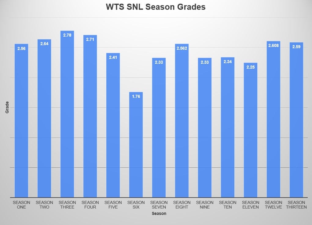 Well, here are the individual charts for each season, which will show you which episodes were graded the best and which episodes were the worst. Again, we grade each sketch (including “Weekend Update”) on a 1 to 5 scale, with a “1” being downright appalling, to a “5,” which is an all-time classic. (We do not grade musical performances.)