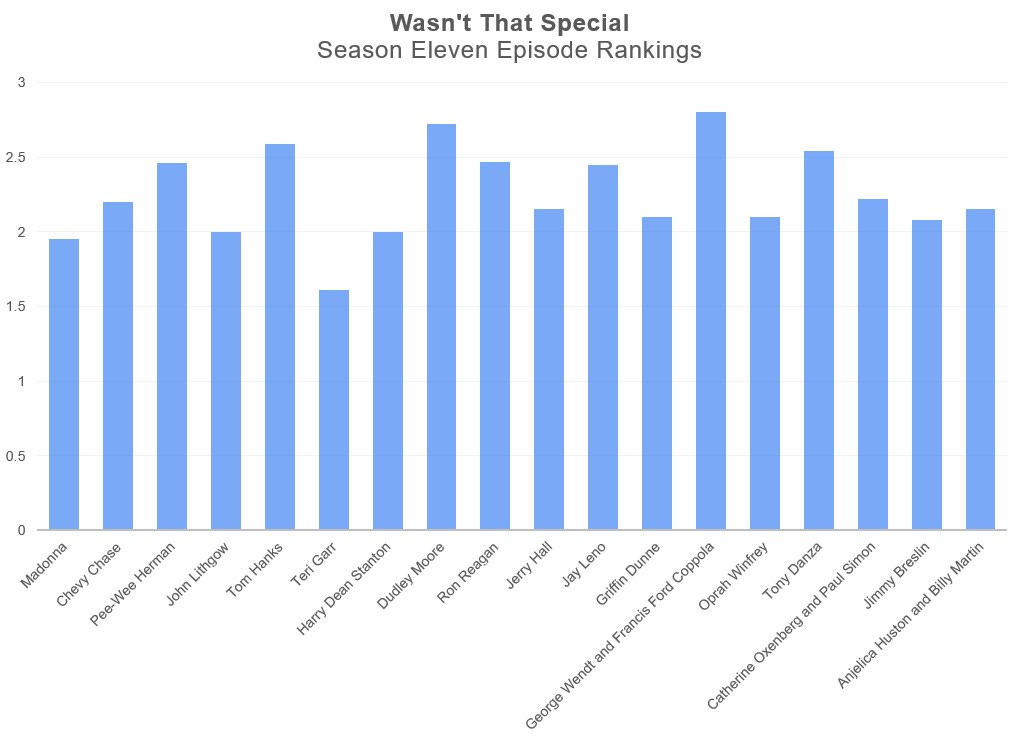 If the theory of quality is correct, we should then probably rank Season 5 over seasons Seven and Nine, given it has 45.5% of sketches in the top three tiers, as opposed to 42% in Season Seven and 42.4% in Season Nine. Season Eleven not only has only 36.7% of sketches in the top three tiers, it didn’t have a single “5”-rated sketch.