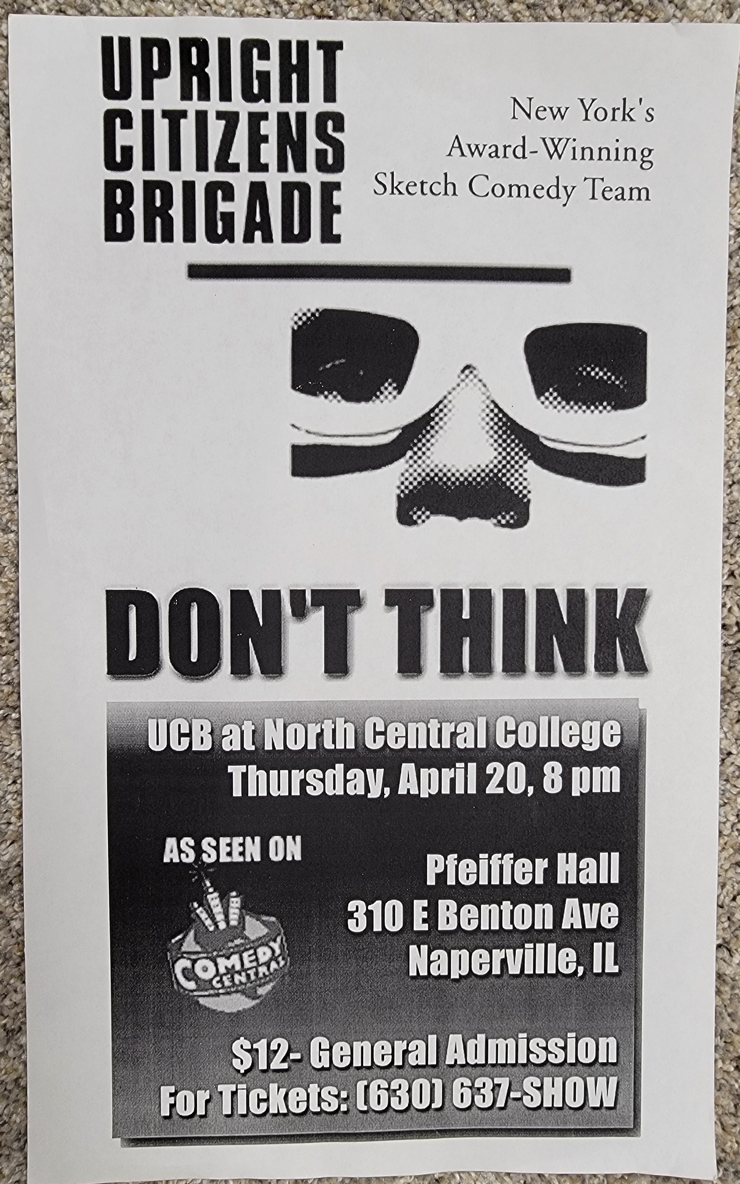 My fellow editors and writers at The Kindling were huge UCB fans, so it was not a tough sell to get them on board. What was a tough sell was convincing the administration and the student activities board to make it happen. We would need to use Pfeiffer Hall, the College’s main performance building, and to secure funds to set things up before we could make the money back on ticket sales. I honestly don’t remember the exact talent fee for UCB, but the number $7,500 is rattling around in my head. Or maybe $8,000 since that would be easier to split four ways. In any case, we also needed to figure out potential dates, flight and transportation issues, hotel accomodations, and contractual questions. This was a lot of responsibility for a handful of 19 and 20-year-olds.