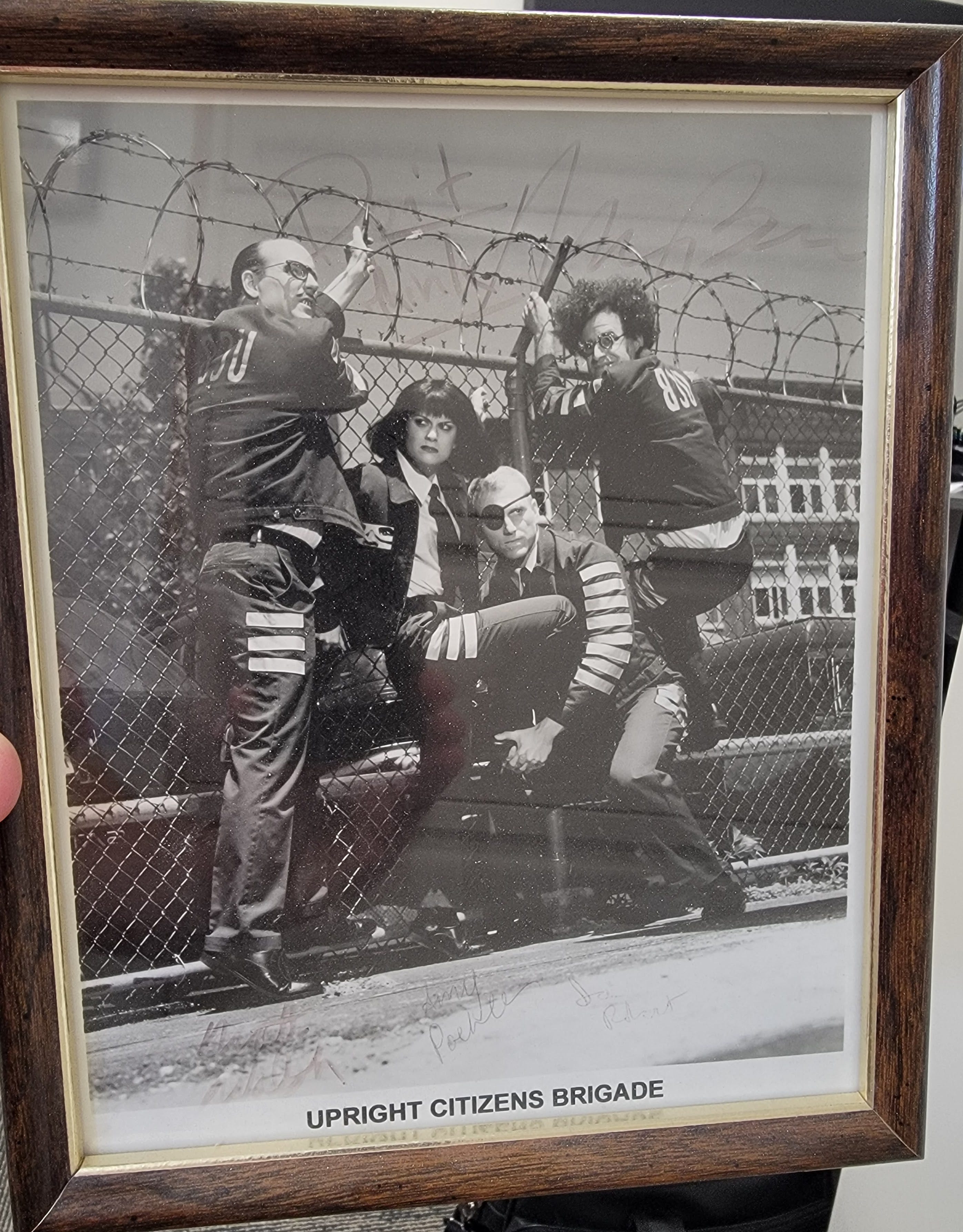 (Everything’s faded above after 25 years or so, but it says “Don’t Think!” a key catchphase from the Upright Citizens Brigade TV show and is signed by all four members)