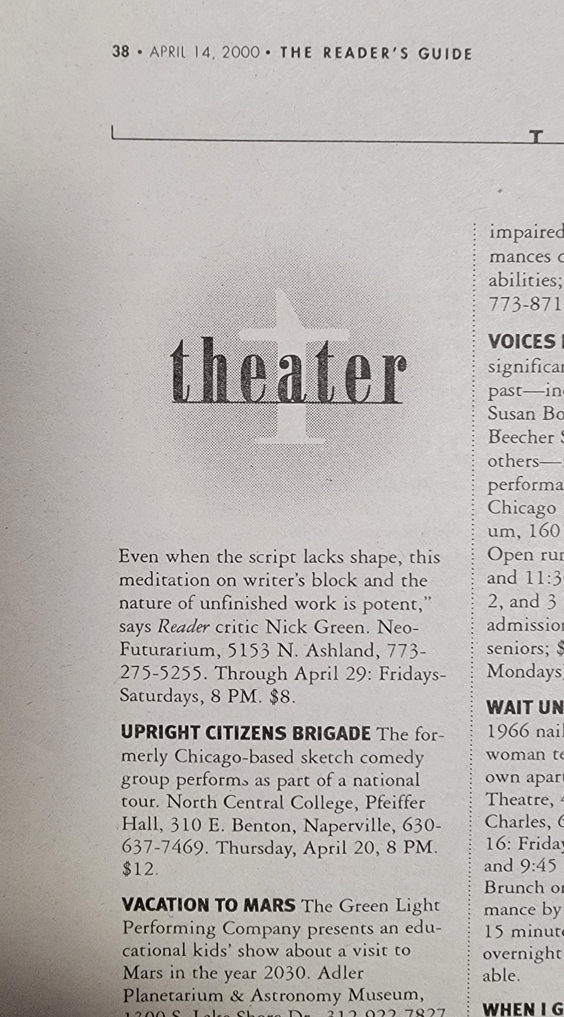 On the day of the event, Mike and I were tasked with picking up Amy, Matt, Matt, and Ian at the airport. We borrowed a big NCC van and made our way to O’Hare. This was pre 9/11, so we were able to walk right up and wait at the gate. I remember crafting a sign that said “UCB” to hold up like all the limo drivers do in the movies. I drove them to the hotel, where they checked in, and then spent most of the afternoon with them as we gave them a tour of the theater and took care of any last-minute questions or concerns.