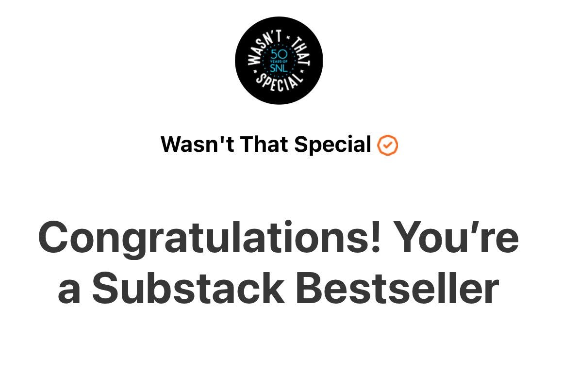 That’s right! Your favorite podcast is now a SUBSTACK BESTSELLER. And, while we’d like to take credit, the truth is we couldn’t have done it without you. We appreciate your interest, support, and commitment to the show and pledge to continue delivering the most comprehensive, smartest, sharpest, funniest look at Saturday Night Live’s 50 seasons (and beyond) that you’ll find anywhere. In honor of the occasion, feel free to pass along this link for friends and family to join us here. They’ll get 15% off the first year’s subscription! Here you go: https://www.wasntthatspecial.com/9443127d